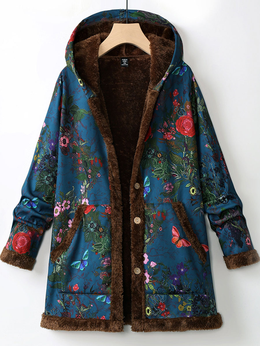 Casual Loose Cashmere Thickened Floral Print Hooded Coat
