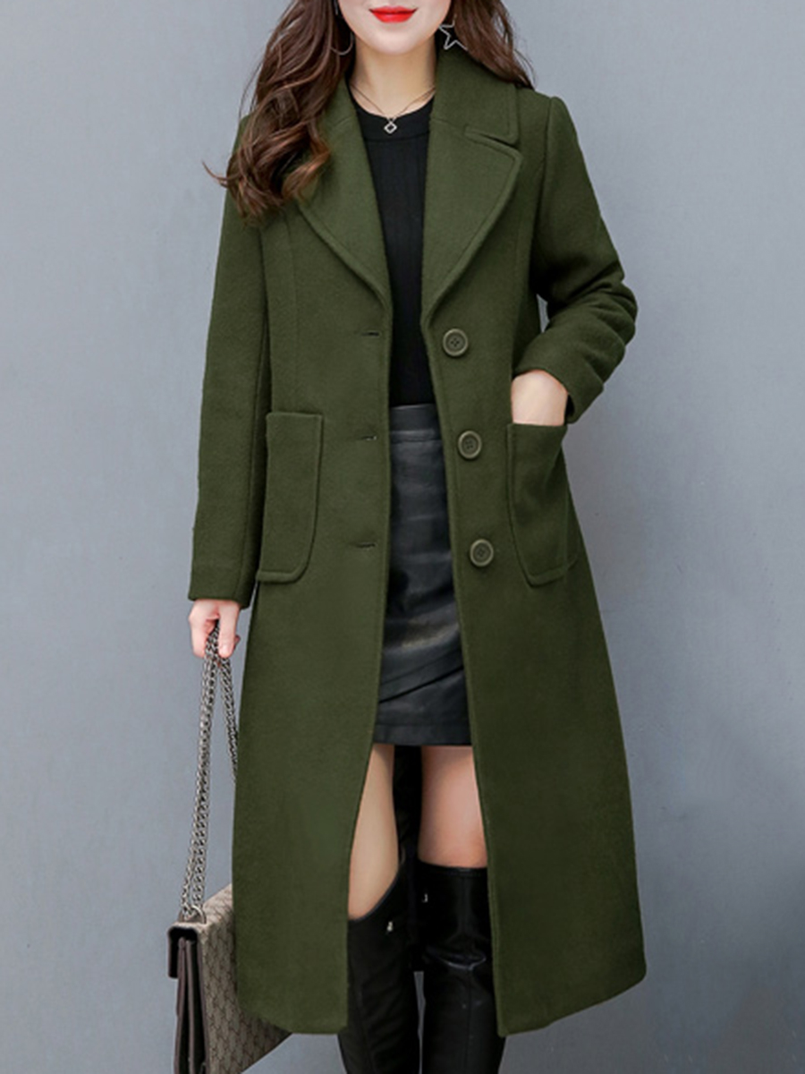 Lapel Plain Patch Pocket Single Breasted Long Woolen Coat